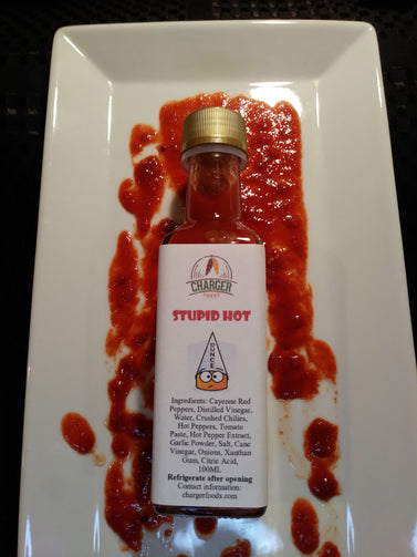 Stupid Hot is hotter than your average cayenne hot sauce. Great with chicken wings, classic marinara sauce, or drizzled over a slice of pizza.